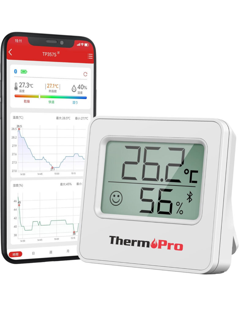 湿温度管理には、サーモプロの湿温度計を使っている。Bluetoothでアプリ連携できるので、屋内から湿温度のログや監視ができて便利。湿温度のアラートを設定することも可能。