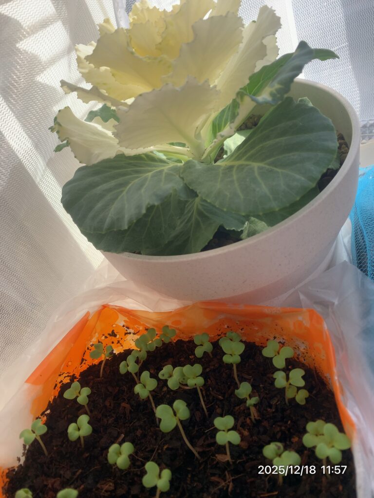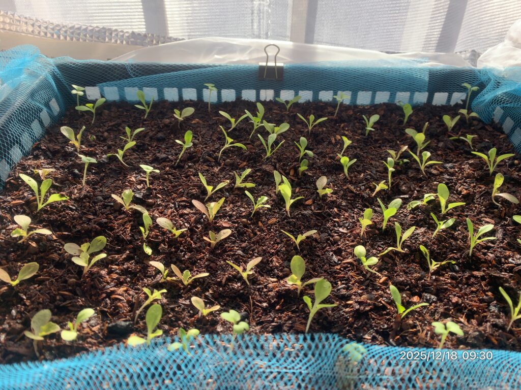 エンドウレタスは、水が少ないと苦味がでたり充分なCaの供給ができなくなる。水不足のときは葉が立ち色が濃くなる。根も浅くなり株が弱くなるため水をたっぷり与える必要がある。日中たっぷり潅水した。葉が膨らみ大きくなった気がする。根が呼吸できるよう水はけを良くして、ムレないよう換気する。