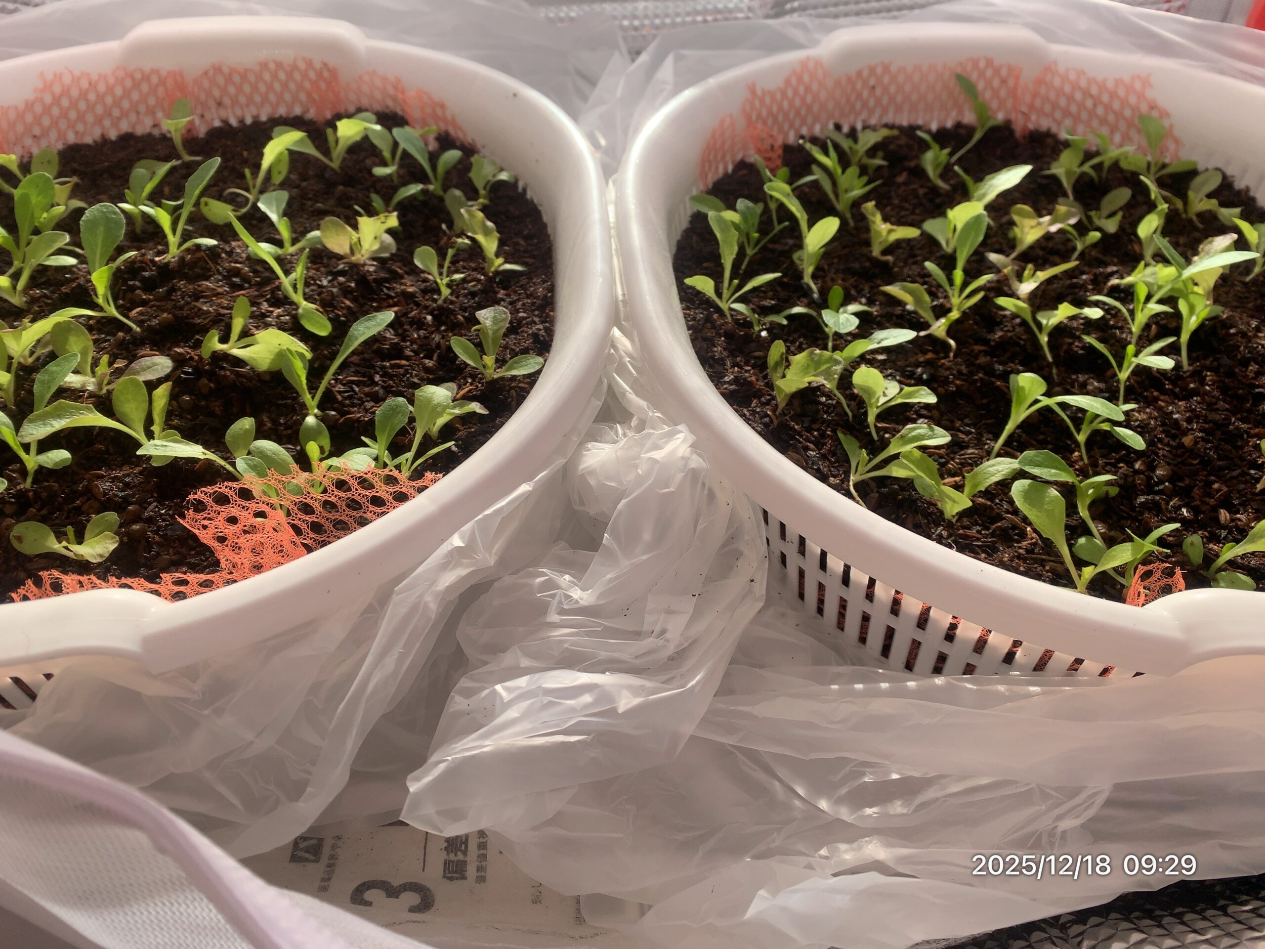 エンドウレタスは、水が少ないと苦味がでたり充分なCaの供給ができなくなる。水不足のときは葉が立ち色が濃くなる。根も浅くなり株が弱くなるため水をたっぷり与える必要がある。日中たっぷり潅水した。葉が膨らみ大きくなった気がする。根が呼吸できるよう水はけを良くして、ムレないよう換気する。