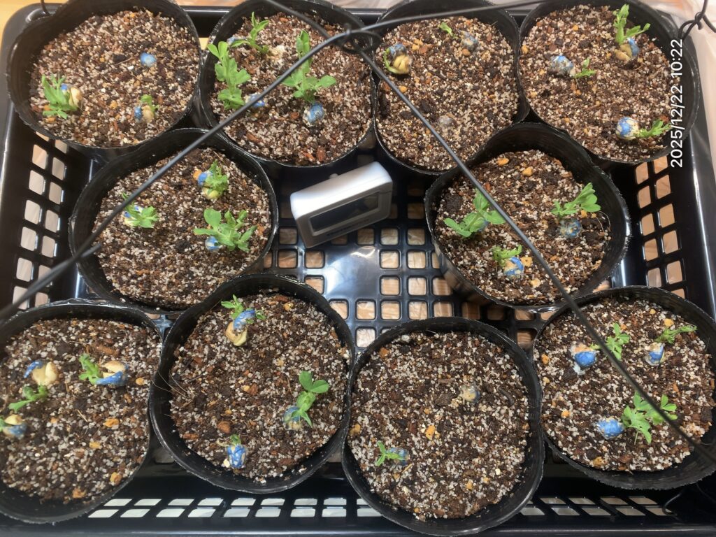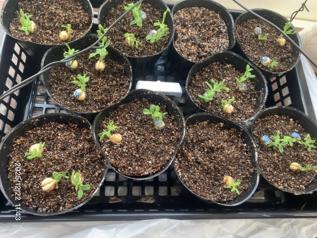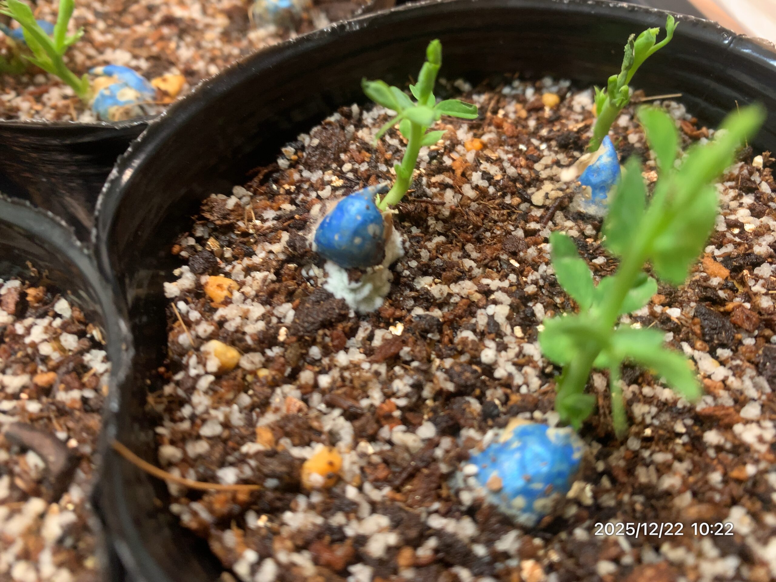 連日雨が続き、珍しく暖くジメジメしていた翌日、白カビが生えていた。調べてみたところ種が埋まった部分の換気が悪かったことが原因のよう。早速付着しているカビをとり、溶けてしまっている種などを取り除く。種を埋めていた土も取り払った。