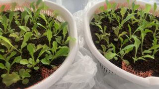 レタスは葉が混んでいたので間引き。徒長していたので、もう少し早めに間引いた方がよいかも。この頃は夜中は氷点下のため、屋内管理中。
