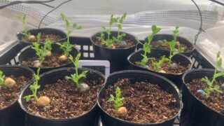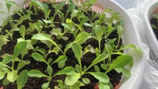 レタスは葉が混んでいたので間引き。徒長していたので、もう少し早めに間引いた方がよいかも。この頃は夜中は氷点下のため、屋内管理中。