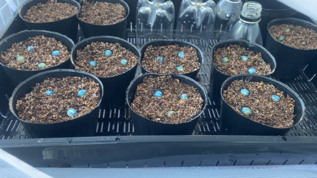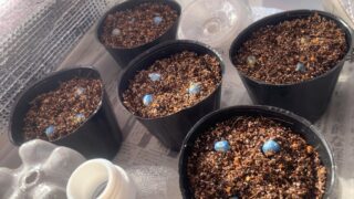 2025.11.28タッパーに水で湿らせたキッチンペーパを入れタネを乗せる、暗くするためタッパーをアルミホイルで包んだ状態で数日おいておくと発根する。ポットは9号サイズを使用。根は数ミリ出ているくらいが良い。植える際は根を傷つけないように注...